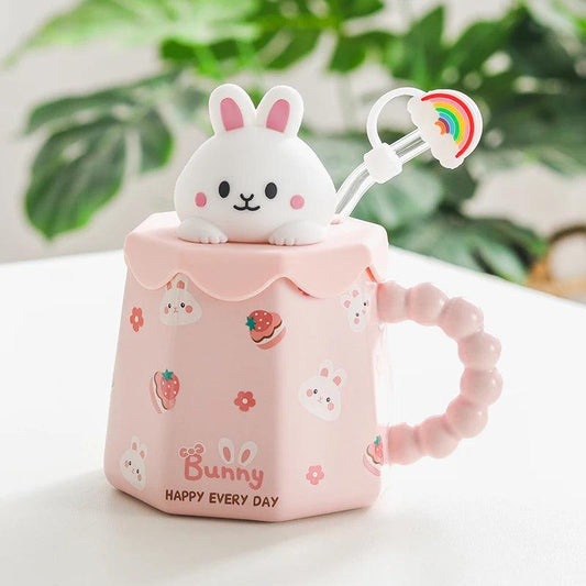 Cartoon Ceramic Mug with Lid, Spoon & Straw